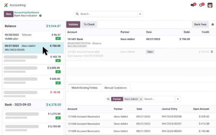 Connecting your bank account takes invoicing to the next level. Odoo synchronises your transactions automatically and uses smart AI matching to reconcile payments with invoices in seconds. No more manual matching or spreadsheets - everything in one place.